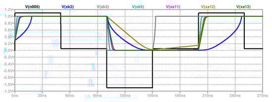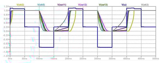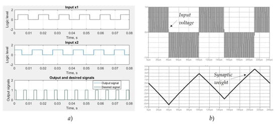 The diagrams of the input voltage signal x1 and x2 for testing the neural net are presented in Figure 9a for the expression of the logic signals. They correspond to logic ones and zeros for the emulation of XOR logic operations. The input signals for training the neural net are very similar; they are shifted according to the testing signals to obtain more realistic results. The diagrams of the input signals of the synaptic circuit and its weight alteration are shown in Figure 9b for the description of its adjustment process. The input signals are a sequence of negative and positive packages of pulses.