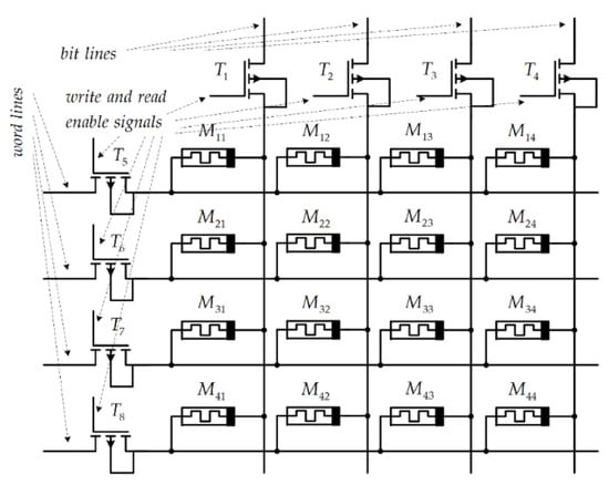 A hybrid memory crossbar based on memristors is presented in Figure 5 for the clarification of its structure and operation. It contains sixteen memristors and eight MOS transistors. The memristors are used as storing elements, while the transistors operate as write-enable and read-enable switches. To enable writing a logical zero or unity in a given memristor, positive voltage pulses must be applied to the gates of the respective MOS transistors.