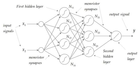 A simple feed-forward memristor-based neural network is presented in Figure 7 for a further description of its structure and operation []. The network is used for the logical XOR function emulation. It contains two input nodes to apply the input logical signals x1 and x2. The neural net contains two hidden layers and an output layer. The first hidden layer is made of four neurons—N11, N12, N13, and N14 with a nonlinear activation function, and the second one contains three neurons—N21, N22, and N23. The output layer contains a neuron with a linear activation function. The synaptic bonds between the neurons are memristor-based. Supervised learning is applied for the adjustment of the synaptic weights, which are founded on memristors [,,]. The other elements of the artificial neural network are based on CMOS transistors.