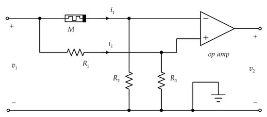The schematic of the applied synaptic circuit is presented in Figure 8 for a description of its topology and principle of operation [,,]. It contains a memristor, three resistors, and an operational amplifier. The input voltage signals are applied to two voltage dividers, which are connected parallel to each other.