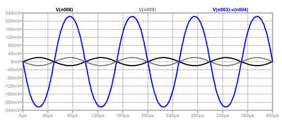 The time graphs of the input and output sinusoidal signals are presented in Figure 11 for confirmation of the correct operation of the amplifier.