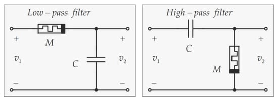 Low-pass and high-pass passive filters, based on memristors and capacitors, are presented in Figure 14 for a description of their structure and operation [].