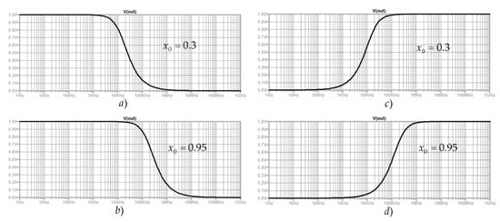 (a) Amplitude-frequency response (AFR) of a low-pass filter for x0 = 0.3: (b) AFR of a low-pass filter for x0 = 0.95; (c) AFR for the high-pass filter for x0 = 0.3; (d) AFR for the high-pass filter for x0 = 0.95.