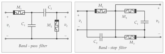 In Figure 16, band-pass and band-stop memristor filters are presented for an explanation of their structure and functioning.