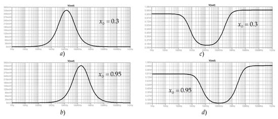 (a) Amplitude-frequency response (AFR) of a band-pass filter for x0 = 0.3: (b) AFR of a band-pass filter for x0 = 0.95; (c) AFR for the band-stop filter for x0 = 0.3; (d) AFR for the band-stop filter for x0 = 0.95.