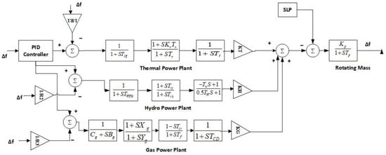 The proposed power network contains three varieties of power-generating units: thermal, hydro, and gas units. Additionally, all three units were considered as a source of a single system and a PID controller was introduced to regulate the oscillation. The Simulink model of the proposed system arrangement is presented in Figure 1. As discussed in [8,9], the mathematical expression of the proposed system is: