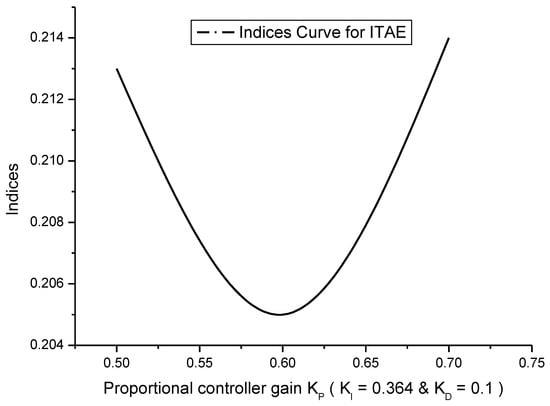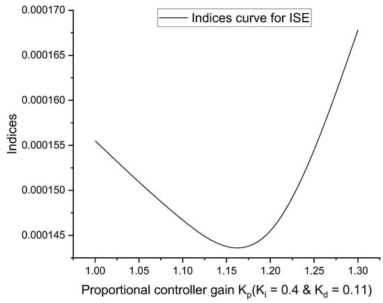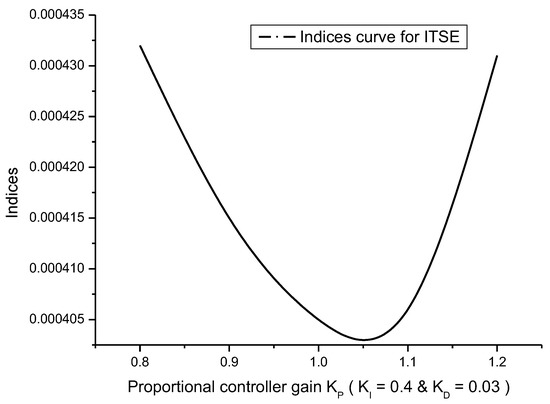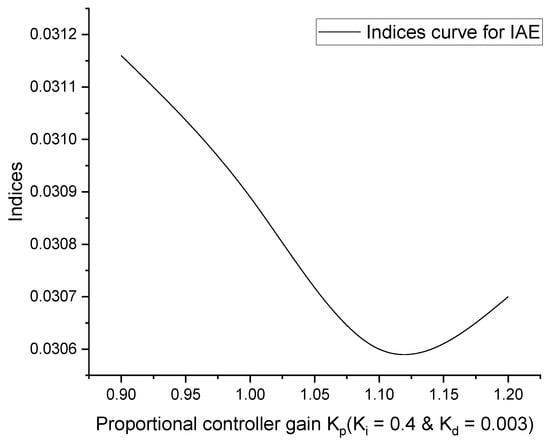 To obtain the optimal controller gain value, the conventional method of trial and error-tuning was used. The first integral gain value (KI) was tuned using the trial and error procedure in this tuning process. After determining the optimal gain value for KI, it was set as a constant value. Following this, the proportional gain value (KP) was tuned to achieve its optimal value, just like the integral gain value. Following this, the KI and KP were fixed as constants, and the derivative controller gain value (KD) was adjusted as suggested by [3,4]. Figure 2, Figure 3, Figure 4 and Figure 5 depict the curves as to the performance indices for the IAE, ISE, ITAE, and ITSE, respectively.