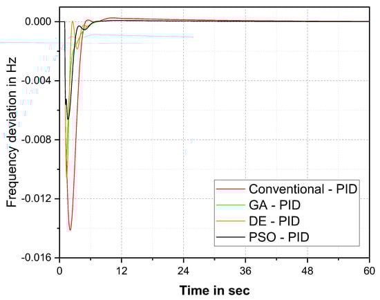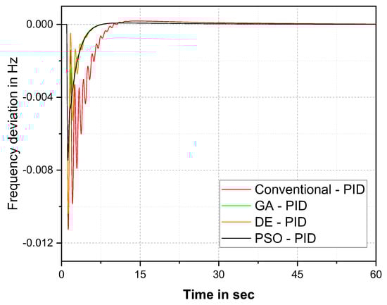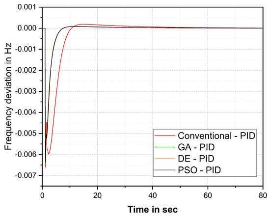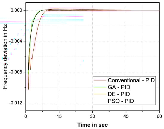The ISTE cost function-based frequency response comparison in Figure 9 and Table 6 demonstrate that the PSO–PID controller provides better results than the other optimization techniques. The PSO–PID controller settled the oscillation at 39 s. The improvement of the PSO–PID controller over the conventional method was 49%, over GA was 15, and over DE was 8%. The graphical and numerical comparison of del F for ITAE cost function is given in Figure 10 and Table 7 respectively.