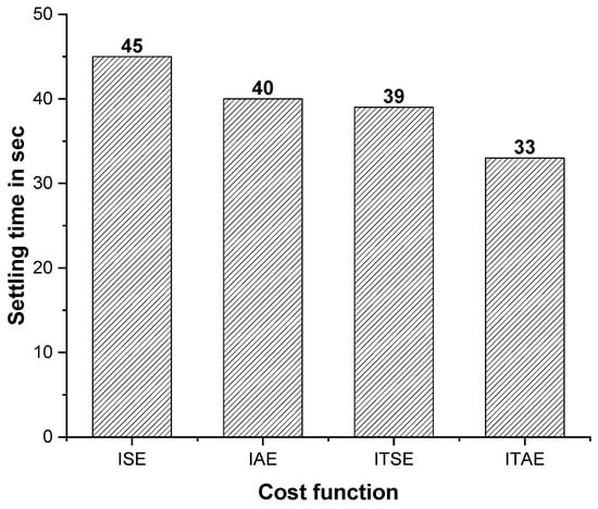 Finally, the PSO–PID controller response with all four cost functions was compared by a bar chart in Figure 11. It shows that the ITAE cost function-based PSO–PID controller provides a better response than other cost function by means of fast settled response over other cost functions (IAE, ISE and ITSE).
