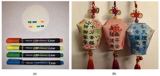 (a) Highlighter color pens and white filter papers used for chromatography experiments.; (b) decorative lights with randomly blinking LEDs used for dynamic colorimetric image analysis.