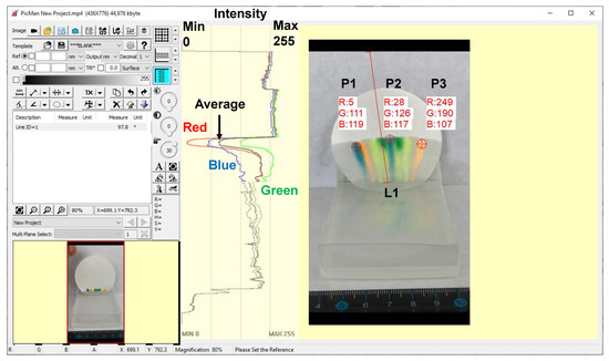 Figure 2 shows a screen captured image of the PicMan software being used for color analysis of three specific points (P1, P2 and P3) and a line segment L1, on a frame extracted from one of the video clips. The video clip used in the figure has eight (8) colored dots marked by highlighter pens. The absorption of water by the filter paper and the diffusion of colored ink dots were recorded with 30 frames per second (fps) for 180 s. The total number of frames for this specific video clip is 5400 (=180 s × 30 fps). In other words, each pixel on the image has 5400 points of time-series, RGB intensity data for a period of 180 s (30 points per second, frame rate). The figure shows an RGB intensity graph along the line segment L1. The RBG intensity range is between 0 and 255 because the intensity of each color channel is assigned to 8-bit (28 = 256) levels. The line intensity data can be exported as CSV files for further analysis and customized graphical display. The colors of the lines in the intensity graph represent each color component. The gray line is the average of RGB intensity in the 0~255 range. The solid lines in the line intensity graph represent the intensity of RGB channels in the line segment L1, while the dotted lines represent the line intensity of RGB channels outside of the extended portion of the line segment L1. As seen from the line intensity graph, the color ink on the line segment L1 travels with the water, leaving a bright yellowish color as a trail. Visual inspection can also be used, but it would be very difficult to quantitatively record results and the subjectivity of all records could not be avoided.