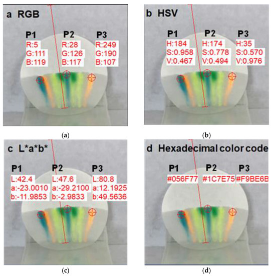 For image display on a monitor screen, color is reproduced by combinations of RGB intensity. Each pixel has three 8-bit intensity values (3 channel × 8 bit = 24 bit) and can display 224 (=16,777,216) colors. The RGB color system is one of many color systems used in practice. For image display, an RGB color system is used and all colors are uniquely identified as RGB-based hexadecimal color codes. For printing, CMY (cyan, magenta, yellow) and CYMK (cyan, yellow, magenta, key) color models are used. The HSL (hue, relative chroma, intensity) and HSV (hue, saturation, value) color systems are also frequently used. The CIELAB color space often referred to as L*a*b* is a color space defined by the International Commission on Illumination (CIE) in 1976 [31,32,33]. Color conversion between different color systems is often required for imaging system calibration and comparison with color standards or acquired images of standard color palettes. To accommodate the technical requirements for practical use, the PicMan software added the color conversion function. Color information on point(s), line(s) and area(s) of interest can be converted into the desired format and exported as the CSV file format. Figure 3 shows examples of color conversion of three points (P1, P2 and P3) on the image, as displayed on the screen, between color systems. HSV and L*a*b* color systems can also be used instead of the RGB color scale. The color information can also be exported in the hexadecimal codes and Munsell color system. To use general photographs and video images with RGB scale for calorimetric determination, it is convenient to use the original format from imaging devices without colorimetric conversion into other color systems.