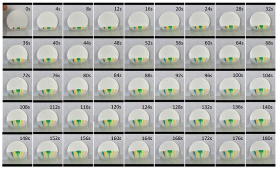 Figure 4 shows 45 images sampled every 4 s from a 180-second-long video clip (30 fps × 180 s = 5400 frames). It only shows less than 1% (45 frames/5400 frames = 0.83%) of the total information recorded in the video clip. We are not utilizing 99.17% of the available images. By scanning well-organized time-series images, we can form an opinion on the movement of colored ink from the chromatography experiment. Without proper image analysis software, we can only rely on manual, time consuming measurements to form even a qualitative and subjective opinion. We can only verbally describe how the colored ink was diffusing with water absorption by the filter paper.