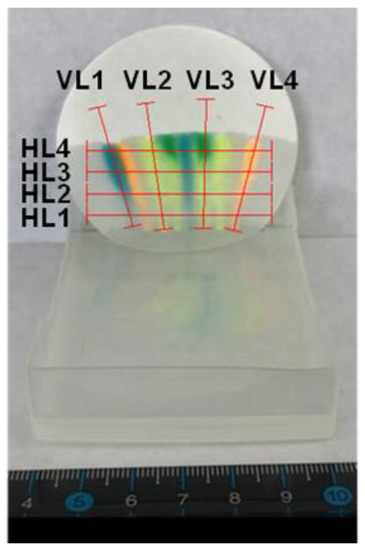 Time cross-section operation of PicMan was used to synthesize new images from the start (frame 0) to the end (frame 5400) of the 180-second-long video clips of a chromatography experiment. Figure 5 shows four vertically sloped line segments and four horizontal line segments of interest for information extraction. The synthesized time cross-section images of the eight-line segments from 5400 frames of images are shown in Figure 6. The horizontal axis represents time in seconds. It can be used as a reference for frame number by multiplying the frame rate of 30 fps by the time elapsed. As seen in the figure, ink diffusion speed and color change with time (or water absorption and ink diffusion) are well summarized as a time-synchronized, newly synthesized image. From the upper half of a synthesized image (four vertically sloped line segments), we can easily recognize ink diffusion speed, ink color separation and cumulative diffusion length. From the bottom half of the synthesized image (four horizontal line segments), we can see the time required for the ink to cross the horizontal lines. The synthesized images can also be used for additional color information analysis using PicMan for additional insights. All data can be exported in various formats: CSV files, line graphs, modified or processed images and/or newly synthesized images for efficient and effective use of image-based experimental data sets.