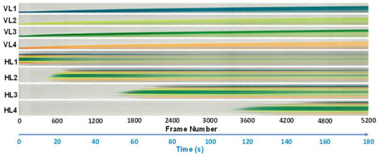 Exported time cross-section image across the eight-line segments (for vertical line segments VL1~VL4 and horizontal line segments HL1~HL4) for 0–180 s (30 fps × 180 s = 5400 frames) using PicMan.