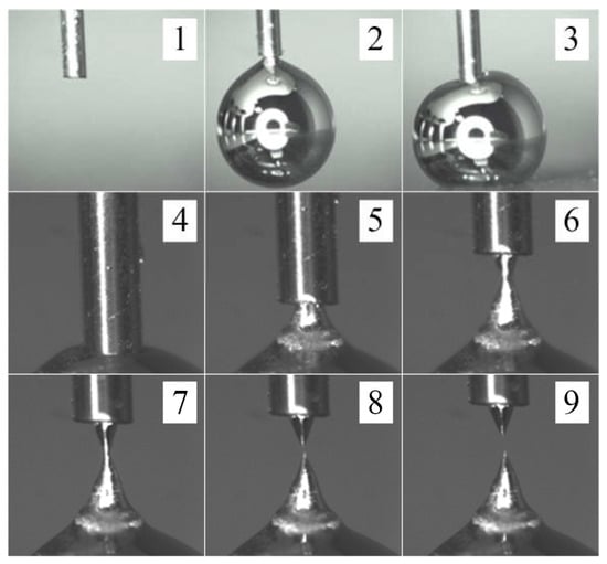 7. The formation of a cone-shaped probe. While observing the transition diameter of the order of 100 μm in an optical microscope, the withdrawal speed of the probe from the droplet is reduced to 40 μm/s;