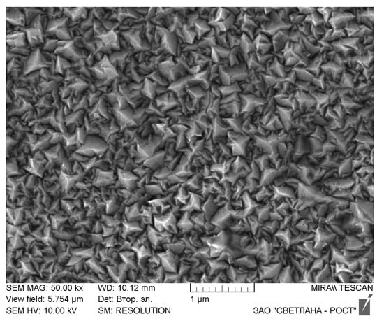 Zinc oxide test samples were obtained as follows: ZnO layer was deposited on conductive FTO substrates using ultrasonic spray pyrolysis [20,21,22]; 0.1 M aqueous solution of zinc acetate served as the sprayed solution, the substrate temperature was 270 °C and the spraying time was 10 min. Subsequently, ZnO nanoparticles were grown on the substrates by the hydrothermal method. To do this, a substrate with a ZnO film applied by spray pyrolysis was lowered into an aqueous solution of zinc acetate, hexamethylenetetramine and cetyltrimethylammonium bromide, and kept in a thermostat at a temperature of 85 °C for 60 min. Once the given time had elapsed, the substrate was washed in distilled water and dried in the atmosphere at room temperature.