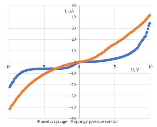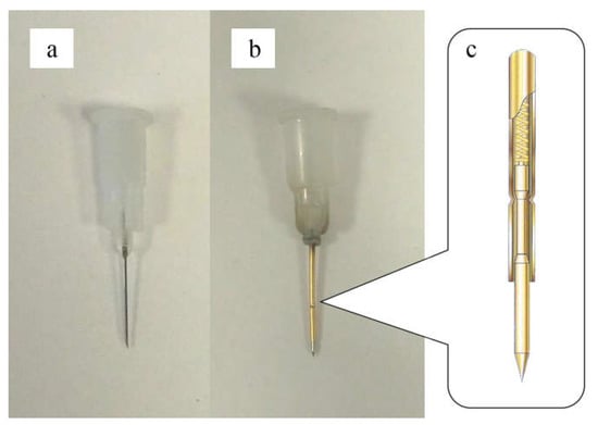 For the measurements, an insulin syringe with a needle (Figure 6a) and a spring contact (P100-B1 brand) were used. The spring contact was fused into the plastic tip of the syringe (Figure 6b). The diameter of this probe is 500 µm.