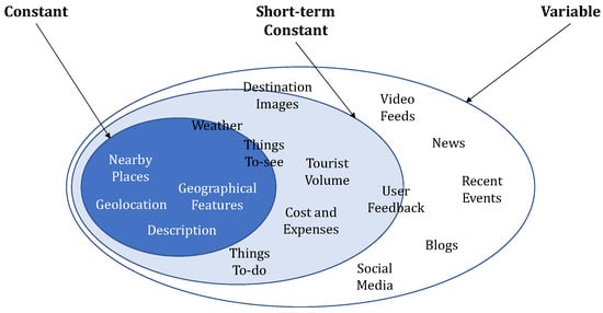 Context-aware recommendation of personalized tourism resources has been made possible by improvements in computing capabilities and the invention of powerful filtering algorithms which can match a user’s profile in the form of interests and contexts against a large knowledge base of tourism resources []. However, this knowledge base requires a collaborative development approach due to the heterogeneity, volume, and dynamic nature of the underlying resources as outlined in Section 2. In [], the authors mined information from social media, community-based photographs, and user experience to come up with the final top k query algorithm. Inspired by these studies and specifically by the framework presented in [], we first categorized the potential information modeling from big data sources according to their permanence in determining travel recommendations, as shown in Figure 2.