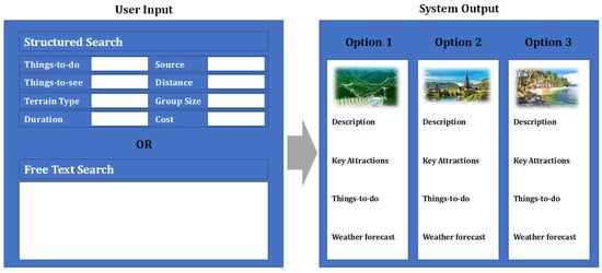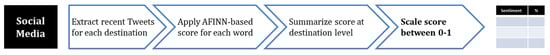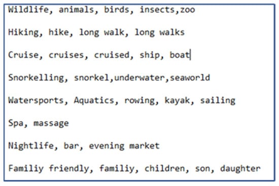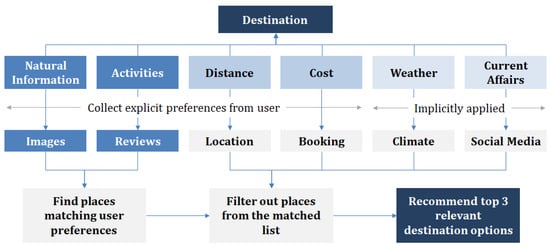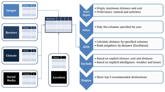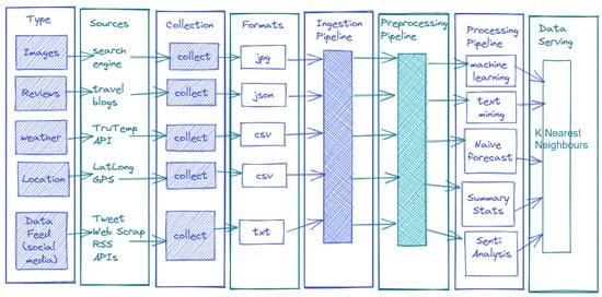 Value: The value of all these sources of information can be described by their importance in driving better and more tailored recommendations for the users. Destination images have also been used in different ways, either to capture a customer’s lifestyle attributes or to detect their choices and preferences []. Twitter data have also been used for the same purpose in other studies []. Weather and cost information by actual users can drive higher reliability of the findings [].