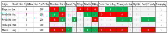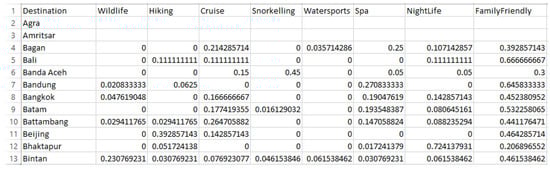 Once each module provides satisfactory results, our model uses triangulation and interpretation of these results in stage 6 to create a consolidated list of attributes describing each destination. These attributes include the activities, offerings, geographical features, or other relevant information that are pertinent for a user’s decision making. Similar to the findings in [], we expect these attributes to help create a “destination image” in the user’s mind. A key benefit of this modular approach is the flexibility of addition or deletion of big data sources in future providing scope for scaling, without disrupting the functioning of the TRS. The output of stage 6 is a structured data matrix where each row represents a destination and the columns capturing the degree of fulfilment of different attributes for that destination, e.g., for Singapore as a destination, the attribute “beach” may have a value of 1, whereas the attribute “mountain” would have a value of 0. Furthermore, our TRS is modeled to create normalized fulfilment values for each attribute in the [0, 1] range such that these can directly be interpreted as probabilities.