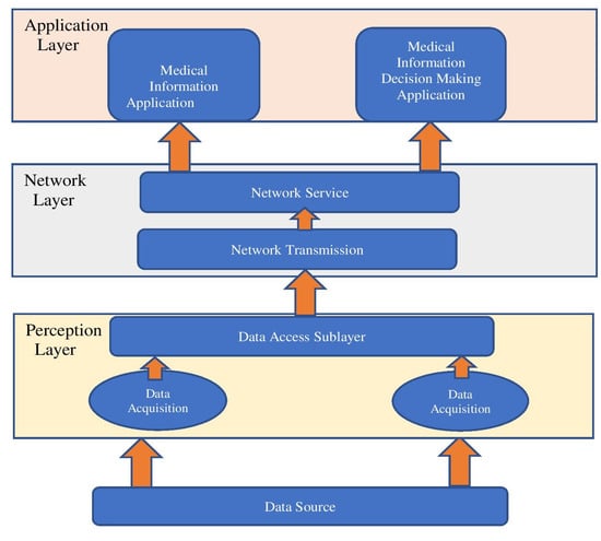 - Sensor layer or perception layer—This is a foundational layer and deals with the collection of data from the source, providing the necessary viewpoint from the gathered data [48]. This layer ensures the precise sensing of the parameters related to health issues [32] and consists of hardware such as sensors, controllers, and actuators. The hardware presently in use includes the radio frequency identification (RFID) reader/tag, GPRS, facial recognition camera, fitness smartwatch, health-monitoring sensors, insulin pumps, and infrared temperature sensors. Wearable sensor devices, implanted sensor devices, and ambient sensor devices are three categories for the sensors [32]. As depicted in Figure 4, the perception layer comprises two sublayers, the data access sublayer and the data acquisition sublayer. The primary task carried out by the data acquisition sublayer is perception of the gathered data, for which it makes use of various medical perception equipment and signal acquisition equipment. Some of the major signal acquisition methods can be GPRS, RFID, graphic code, etc. [49]. Short-range data transfer technologies like Bluetooth, Wi-Fi, Zigbee, 4G, 5G [50,51], etc., are then used to transfer this obtained data to the network layer via the data access sublayer.