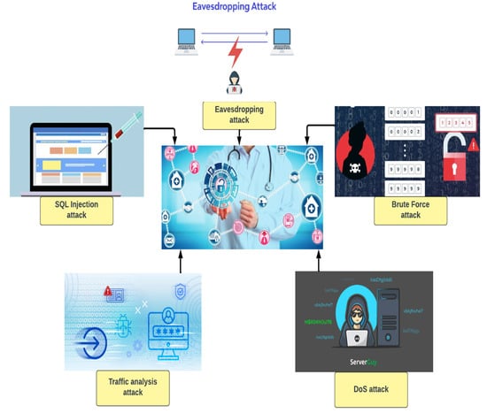 - Denial-of-service attack—This type of attack occurs when an IoT system is prevented from uploading patients’ health information onto the respective cloud-based services or medical database or when the medical professional is unable to retrieve patient information through the IoMT system. Frequent data backups would be essential for recovering historical data, but real-time services would be disrupted. Time stamping and strong authentication on IoMT devices may be taken into consideration to minimize these types of attacks [52].
