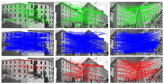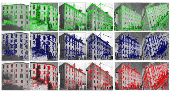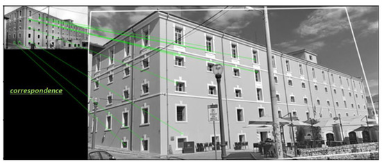 An image is a result of a camera recording and is a way to capture reality. The images, which capture an entity over time, such as a building, were not captured under the same conditions. Therefore, for their comparison, feature extraction and matching techniques should be applied. Specifically, for feature extraction and matching from two or more images of the same scene but from different viewing angles and captured from the same or different camera, homologous point detection techniques are used. This is an important task in image analysis [5]. Especially, it is the primary preprocessing image step for further processing, and it has been widely applied in various computer vision applications, such as pattern recognition, robot navigation, image stitching and mosaicking [6], visual odometry [7], pose estimation, object classification, and 3D reconstruction in the case of 3D images [8,9]. In the case of buildings, this procedure is of major importance, as in a further analysis of the images they can be compared and identify possible lesions and deformations. To achieve strong feature matching, the invariant properties of the images should be utilized in order that the extracted features not vary with respect to lighting changes, scale, position, rotation, and viewing angle [10].