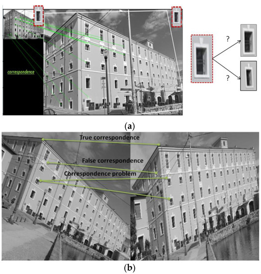 The correspondence problem remains one open issue. Given two or more images of the same scene captured from different perspectives, the correspondence problem refers to the problem of determining the parts of an image to which parts of another image correspond, i.e., the points of features in an image are the same with another image and create homologous points. In addition, the problem intensifies further because of other factors that are mentioned above [50,51]. Figure 4 shows an example of the correspondence problem.