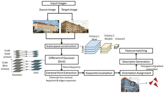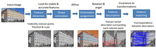 SIFT (scale-invariant feature transform) algorithm has been proposed by D. G. Lowe [35] and extracts invariant features. Today, it is globally accepted and is considered the best and most accurate algorithm. The algorithm detects local features (keypoints) and localizes them on the image. Its greatest advantage is that SIFT is robustly invariant to image rotations, scale, and limited affine variations, while its main drawback is the high computational cost. Figure 9 illustrates a SIFT workflow chart.