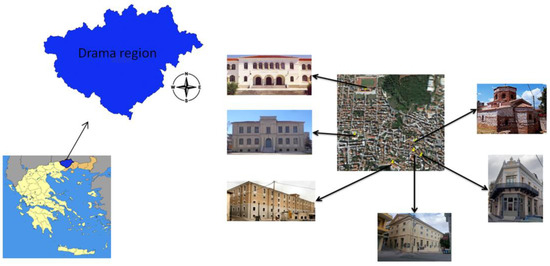 Drama city is part of the East Macedonia and Thrace region (Figure 6) and is located in northeastern Greece. Drama has experienced a great economic boom mainly during the Ottoman era with tobacco production and trade. This area was chosen, as it is a tourist attraction because of the various historical events over time and is considered a cultural center of great interest with milestones of various architectural orders.