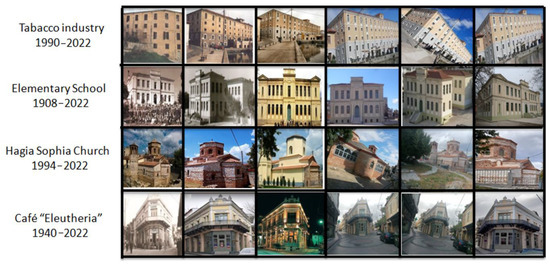 For the needs of the experiments, various images, with landmarks at various years, under different condition shots, and with different lenses for analog cameras and digital cameras, of Drama city in Greece were collected from the site https://gr.pinterest.com/ (accessed on 13 January 2023) and books. In addition, we used images from personal files received on mobile phones such as Samsung A21 and Huawei P20 Lite. Furthermore, historical photo collectors have offered us some images from their collections. Note that the collection of images of historical buildings over time requires very extensive and systematic research in a large volume of files and different sources that may not be easily accessible. Finally, our dataset includes four different landmarks: tobacco industry (1990–2022), elementary school (1908–2020), Hagia Sofia church (1994–2022), and café “Eleutheria” (1940–2022), where each landmark contains 28, 7, 39, and 17 images, respectively. Figure 7 shows a sample of our dataset.