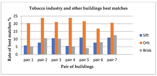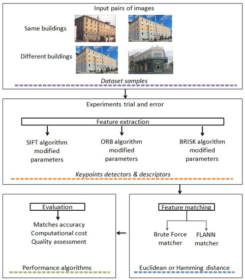 In this work, we carry out experiments using handcrafted matching methods to investigate feature extraction and matching for identifying historic buildings over time that the tobacco industry is the basic building of this study. Specifically, we implement a trial-and-error method to find the best parameters of algorithms that make them efficient. It should be noted here that this is not a generic approach, and thus, the extracted parameters may need to be recalculated for large deviations in the buildings’ architecture. The focus of this work is οn the employment of well-established algorithms in the field of image matching to be systematically applied to the problem of historical buildings’ identification over time, given their indisputable performance and considering the limited data at our disposal. To this end, we apply classical algorithms to pairs of images, such as SIFT, ORB, and BRISK. These algorithms were selected because they present some advantages. For instance, SIFT (scale-invariant feature transform) is perfectly suitable because it detects features that are invariant to image scale and rotation. Moreover, features are robust to lighting changes, noise, and minor changes in viewpoint. ORB features are also invariant to scale and rotation, while the BRISK algorithm is robust to noise and invariant to scale and rotation. All the experiments were designed and implemented in Open CV. Figure 8 shows the workflow chart of our methodology.