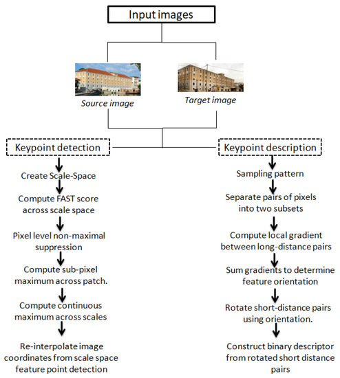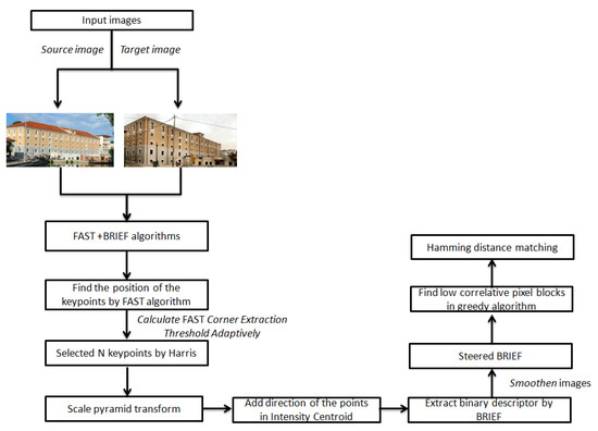 The ORB (oriented FAST and rotated BRIEF) algorithm [36] is a combination of FAST (features from accelerated segment test) [73] and BRIEF (binary robust independent elementary features) algorithms [74,75], with some changes to improve accuracy. Figure 10 illustrates the workflow chart of ORB.