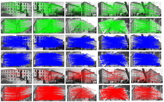 Keypoints detected by SIFT (green), ORB (blue), and BRISK (red) algorithms between different buildings. The first column includes two modern buildings. The second column includes two stone buildings, and the third column includes two buildings of the same order and at the same time; one is historical and the other modern.
