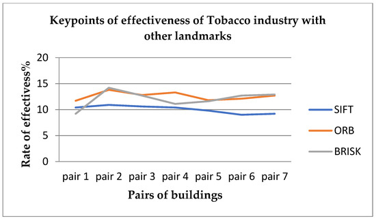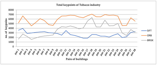 In this subsection, the visualized results from representative images of features extracted and matched by algorithms, both of the same building over time and between different buildings based on certain criteria, are presented. Figure 12 provides some examples of the tobacco industry from keypoints detected between historic buildings, between historic and modern buildings, and between modern buildings. Keypoints were obtained by SIFT (green), ORB (blue), and BRISK (red) detectors. Figure 13 compares the tobacco industry building with different buildings from various aspects such as date, material, and architectural order.