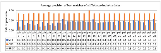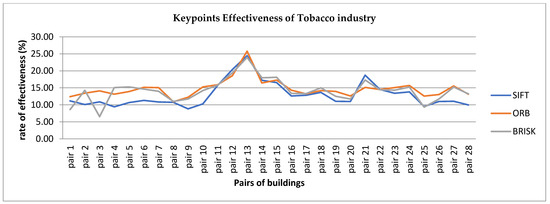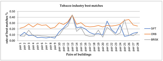 We divided the whole procedure into four stages. Specifically, first, we input pairs of images of the tobacco industry from 1990 until 2022 (pair 9–pair 28). It should be noted that images of 2022 captured the building from different aspects, scales, and rotations. In addition, we consider that buildings from 2021 (pair 6–pair 28) and beyond are modern buildings, whereas the rest are historic (pair 1–pair 5). Besides, we compared each date of the building to all the rest, while then we tested the tobacco industry landmark with three other buildings based on the architectural orders, structure materials, and date. In the second step, we applied feature detectors and descriptions, such as SIFT, ORB, and BRISK algorithms to extract features from pairs of images. In this step, after tests, we modified the algorithm parameters in such a way as to produce the best possible results without interfering with any extra optimization method. In the third stage, we adopted the strategy of nearest neighbor distance ratio (NNDR), which was proposed by K. Mikolajczyk in [67] and D.G. Lowe in [68]. In this case, a ratio of the nearest neighbor to the second nearest neighbor is calculated for each feature descriptor, and a certain threshold ratio is set to filter out the preferred matches. We implemented the brute force matcher [68,69], i.e., a matching descriptor that compares two sets of descriptors’ keypoints and produces a list of matches, and then the FLANN (FAST library for approximate nearest neighbors) matcher [70,71], which is used in two different forms, depending on the algorithm. Finally, in the next step, the matching pairs are evaluated by various quantitative and qualitative techniques. It is understood that because of the different applications of algorithms, it is difficult to judge their performance with a unified and commonly accepted system. Hence, various indicators should be found for evaluation. Commonly, precision and best score matching for each pair of images based on the distance (Euclidean or Hamming) are evaluated as algorithm performance benchmarks [72]. The closer the homologous points between two images, the better and more valid the match is. However, since only these evaluations were not sufficient, we applied additional measures, including the computational cost.