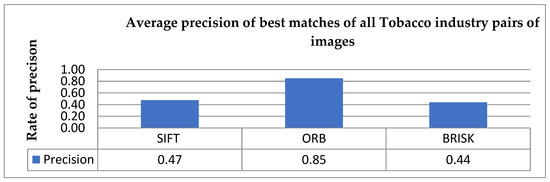 BRISK parameters are threshold, number of octaves, and patternScale. Threshold is used between the center pixel density and the pixels within the circle around this pixel while the patternScale applies this scale to the pattern used for sampling the neighborhood of a keypoint. Initially, the tests were conducted only on the octaves. If the default value is increased then only the number of keypoints decreased is negligible, whereas if the value decreases by 1 then the number of keypoints and total matches are decreased. However, the good matches and the best matching rate are increased. Then we tried to modify the value of patternScale. A value greater than 1 (double, i.e., 2) led to a decrease in all results, while a half-doubling of the value (i.e., 0.5) increased all results, but the results are almost similar to those when default parameters are used. In case all parameters decrease, an increase in total matches is observed; however, it is virtual, as all other parameters remain at the same levels as the default parameters. On the other hand, if only threshold is increased and the other two parameters are reduced, then the number of keypoints and total matches is reduced and the success rate of best matching is increased twice. Finally, reducing only the threshold increases all results except the percentage of success of the matching remaining at the same levels, while increasing the threshold reduces all results dramatically. Finally, the ratio was also modified to 0.85. In Table 1, we present in brief the SIFT, ORB, and BRISK properties and characteristics.