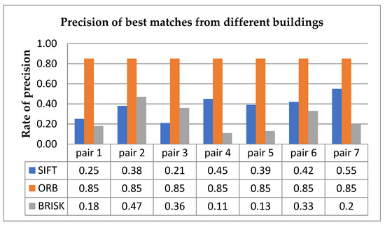 Between historic buildings, the SIFT algorithm detected more keypoints around the point of interest, i.e., windows; however, it did not manage to detect additional features such as walls and vegetation. The ORB algorithm detected more keypoints than SIFT, but they are in scattered form and dense, while the BRISK algorithm detected the least number of keypoints as compared to SIFT and ORB but are more concentrated on corners. Between historic and modern building keypoints were detected by SIFT, mainly on material that divides the texture of the building line under each windows row but not around the interest points such as windows edges and corners. Obviously, the algorithm recognizes the small texture or pattern changes. ORB extracted more and dense keypoints to the entire building, while BRISK detected fewer and sparse keypoints; however, it has more keypoints on all sides of the building. Between modern buildings with different rotation and scales, the SIFT algorithm confirms its advantages as keypoints are detected on all strong interest points; however, it is partially affected by other elements such as water. On the contrary, ORB detected more keypoints, but it seems to present a weakness in the region where the texture or material changes. For instance, there are keypoints denser and scattered near the water. BRISK has the same behavior; however, it has better and more uniform results than ORB.