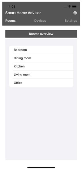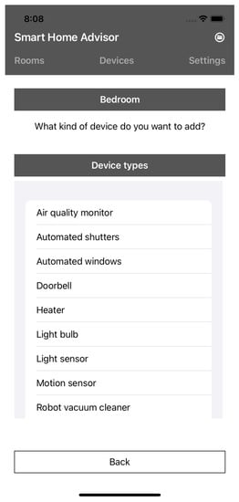 If the user clicks on a room on the tab “Rooms”, an overview of all devices in the room is displayed (see Figure 4). If the user clicks on “Add devices”, an overview of all device types is displayed (see Figure 5) and as soon as a device type is selected, all devices of the type are displayed (see Figure 6).