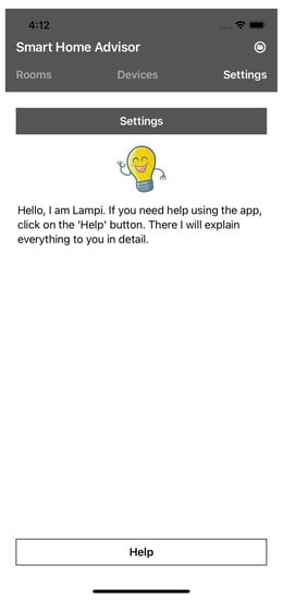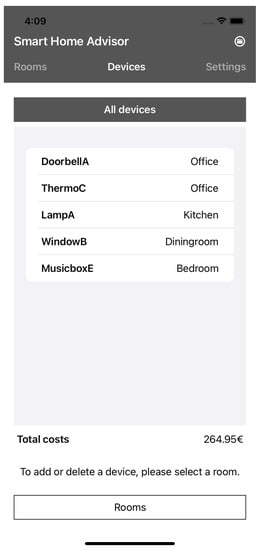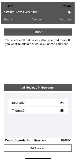 By clicking the “Rooms” tab, the user is shown all rooms that can be equipped with smart home devices (see Figure 1). Under the “Devices” tab, the user is shown all devices that he or she owns, as well as the room in which the device is present (see Figure 2). In addition, the user gets an overview of the total costs of the products. Under the “Settings” tab, the user can read tips for using the application and set the recommendation filter (see Figure 3).