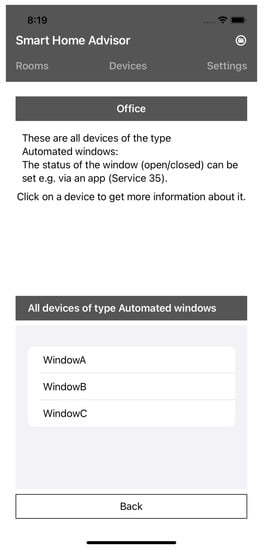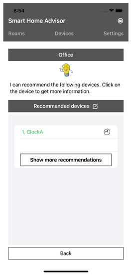 A light bulb icon next to the heading “All devices in the room” also shows the user if recommendations are available for the room (see Figure 7). In addition, the user now has the option of displaying recommendations by clicking on the “Recommendation” button (see Figure 8). Furthermore, all products in the room that can fully use all services are marked with a green font. If the user clicks on the recommendation button, recommendations are displayed according to a recommendation order.