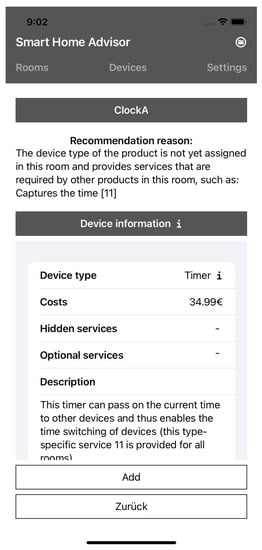 The user can also choose whether more or fewer recommendations are displayed by clicking on the button “Show more recommendations” or “Show less recommendations” (see Figure 8). The structure of the pages does not change. Only the list of recommended devices is extended. Here, all products that can provide all services are also marked with a green font. If the user clicks on a recommended product, the reason for the recommendation is given (see Figure 9). In addition, the services and the required services that are available are marked in green and those that are not available are marked in red. If the user first decides to select a type of device by clicking on “Add device” and then on the desired type of device, he or she can have a product recommended by the type of device by clicking on the “Recommendations” button. If no product can be explicitly recommended by the device type, the cheapest product is displayed. If there is a recommendation for the type of device, all products that can be recommended are displayed. If the user clicks on the recommended product, the reason for the recommendation is displayed.