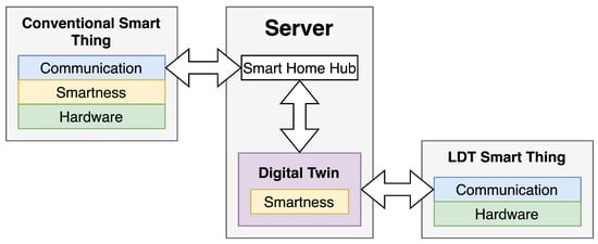 In an LDT architecture, the smartness is implemented in the digital twin and the device implements only basic functions, e.g., light control. Figure 10 summarizes our approach on LDTs. The left side shows a conventional smart thing connected to a smart home hub with smartness implemented in a device itself.