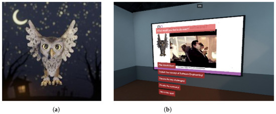 Example of a virtual classroom assistant: (a) an image of the virtual assistant, (b) the use of the virtual assistant for conversation in VR interface.