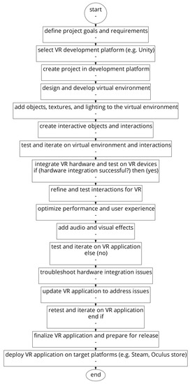 The workflow of VR application development is summarized in Figure 2. The workflow starts with defining project goals and requirements, selecting a VR development platform, designing and developing the virtual environment, creating interactive objects and interactions, testing and iterating on the application, integrating hardware, optimizing performance, and preparing for release. Finally, the VR application is deployed and user feedback is monitored to inform future iterations.