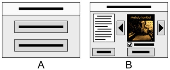 The described VR application for mobile learning linked to museum exhibitions integrates two user interfaces: a main menu interface and a script interface. The main menu interface allows learners to select the type of activity and scenario they would like to start, and provides the option to close the program. The script selection menu window allows script selection through arrow buttons and provides information about the scenario. The script interface provides help information and a script exit function and is divided into different windows: script description, tasks, task descriptions, and script results. The example of the discussed interface is presented in Figure 5, which shows the task selection menu. Navigation between interface windows is possible using buttons that would appear in the original script user interface window. Learners can call up the script interface at any time, and it will be rendered next to their virtual hand. The invoked script interface is used for providing additional information about the scenario and task completion status.