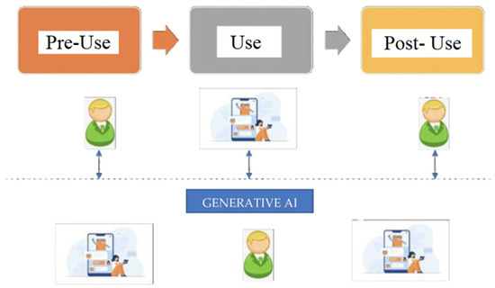 The customer journey consists of several distinct phases, beginning before using GAI, then during use, and post-use. Consumers can consume and distribute content simultaneously through the multiple media and information resources produced during the journey [30,32]. Today, many consumers spend a considerable amount of time researching and communicating before making a purchasing decision. During this process, they can access various interfaces and tools that enable them to manage their options and make informed choices. GAI eliminates the need for manual data analysis and can provide diverse solutions to meet customers’ needs, making it valuable in use cases that involve business enterprises and other future applications.