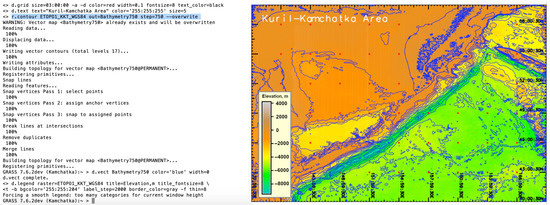 The trial directories were removed from the Unix utility ‘rm’ from a console by commands in two steps: (1) cd /Users/<…>/grassdata (changing to the current folder); (2) rm -r testKKT (here: removing testing folder for the Kuril–Kamchatka Trench with all files). The ‘g.region-p’ command was used to retrieve the information on the data extension and selected region (West, East, South, or North (WESN); number of rows; columns and cells; as well as additional cartographic data: ellipsoid, datum, and zone).