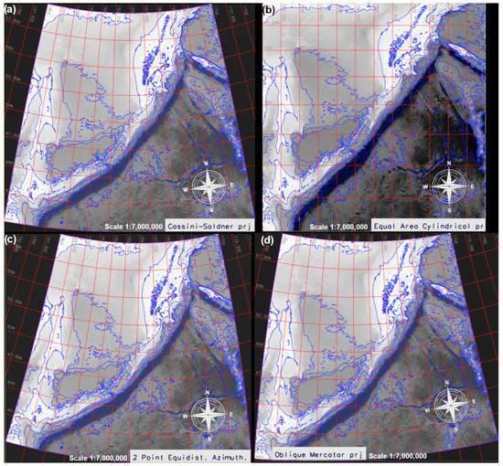 - Evenden, G.I. Cartographic Projection Procedures for the UNIX Environment—A User’s Manual; Technical Report 90-284, USGS Open-File Report; USGS: Reston, VA, USA, 1990.